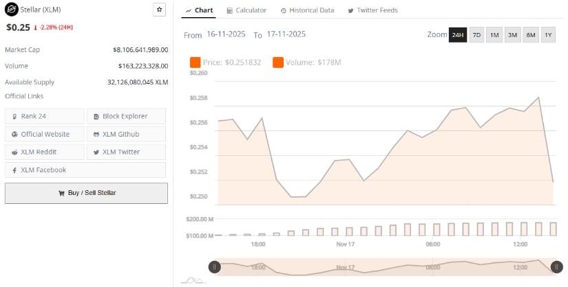 Finora在X平台的最新分析指出,XLM在15分钟图表中正面临"空头趋势",当前价格测试0.255美元附近的次要支撑位。该分析强调明显的看跌动能,且整体趋势尚未出现反转迹象。