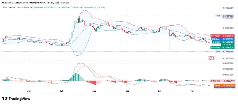 TradingView的XLM/USD图表显示价格在0.261美元附近交投,位于0.282美元的布林带基准线下方,介于0.318美元上轨与0.248美元下轨之间。布林带相对平坦的形态表明波动性较低,该代币已维持窄幅波动数周。