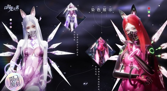 【技术呈现】***腿部的纹身增加闪动的效果,机械猫耳的设计上添加led灯,与机械宠物相互呼应,体现未来机械与仿生感。为了完美展示仿生人的身体曲线,采用了紧身式的裁剪,大量漏出的皮肤部分,让未来科技感更加沉浸;仿生人手镯添加特效光环,减少单一重复的视觉效果,翅膀展开时会有动态示意且配合科技感激光冰花状特效,强化了套装的机械感和科技感;