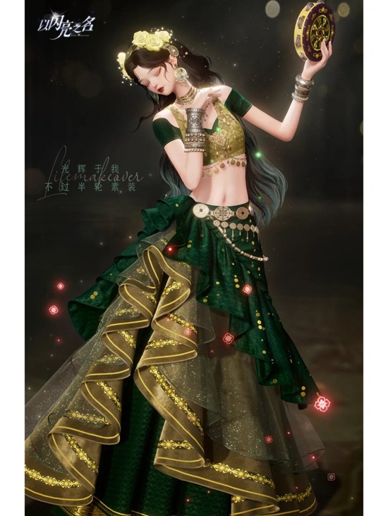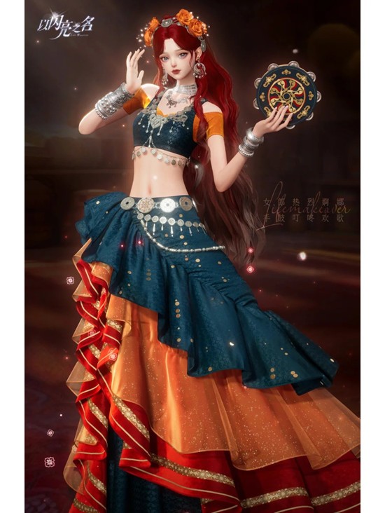 【技术呈现】***作为经典的吉普赛人元素,丰富了手鼓的呈现形式,手鼓在拍打时会有独特的特效飘散在人物周围;同时上衣黑色袖口部分和下装都会有漂浮粒子元素特效,丰富套装的完整性与故事性;