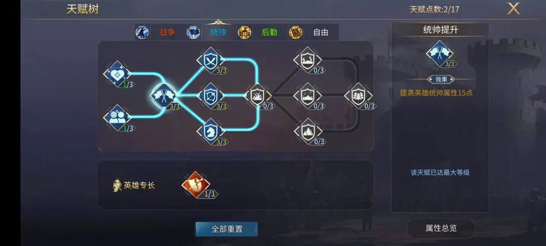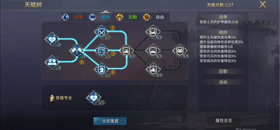 ② 然后就不再点【战争】了,转到【统帅】界面,“治疗提升”、“伤兵转化”、“统帅提升”这三项只需要点亮即可,确保技能树的通畅