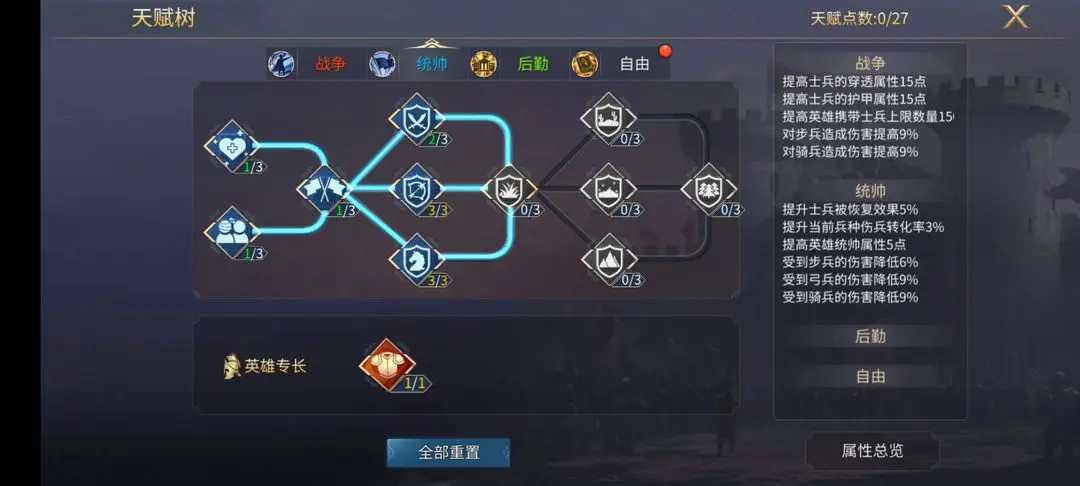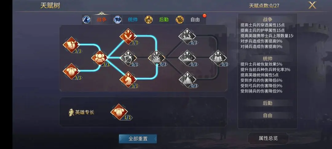 英雄的等级越低,天赋加点越重要,英雄专长大于基础天赋,百分比大于固定值。战争以增伤内容为主,统帅以减伤内容为主,后勤同运输、建设、体力、攻城值等有关系。下文列举了一些各不同类型的英雄推荐的天赋加点内容!
