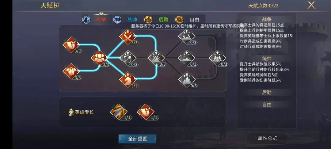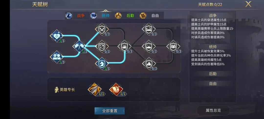 ③ 在统帅的第三排,优先点满“弓兵减伤”,其次是“骑兵减伤”,最后是“步兵减伤”