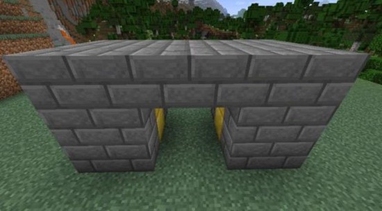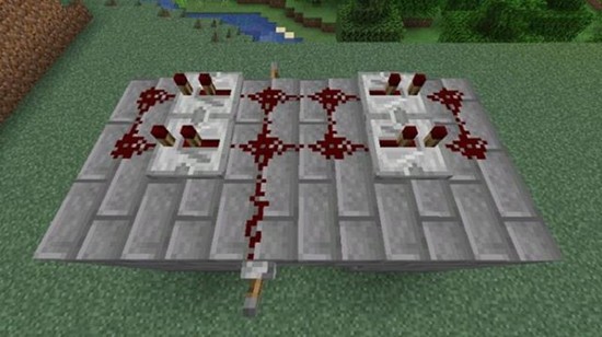 在门拱上方放置4个红石中继器,用红石粉连接并安装拉杆。使用时通过拉杆控制门的开合,关闭时门体与墙壁融为一体,很难被发现。