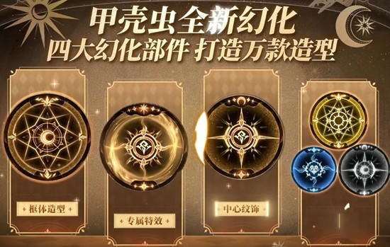 系列中包含四大幻化部件:框架造型、专属特效、中心纹饰和动态背景,每个部件都能单独进行幻化,玩家可以根据自己的喜好自由搭配,创造出属于自己的独特造型。