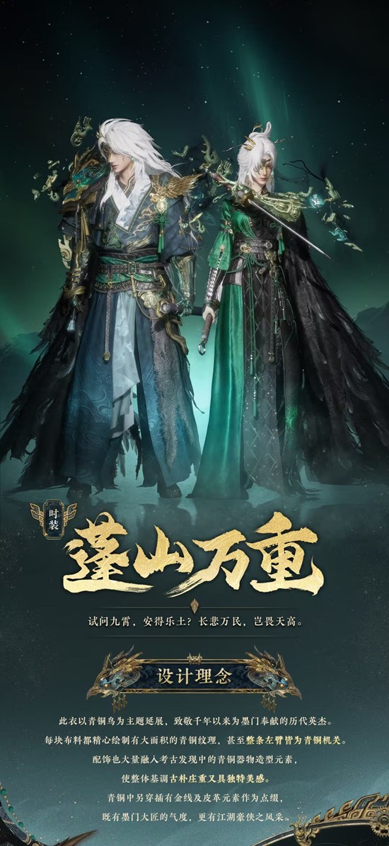试问九霄,安得乐土?长悲万民,岂畏天高。身为承载万千希望的领头之人,他们所站立的地方,便是不见山的风汇聚的方向。此套装以青铜鸟为主题延展,致敬千年以来为墨门奉献的历代英杰。