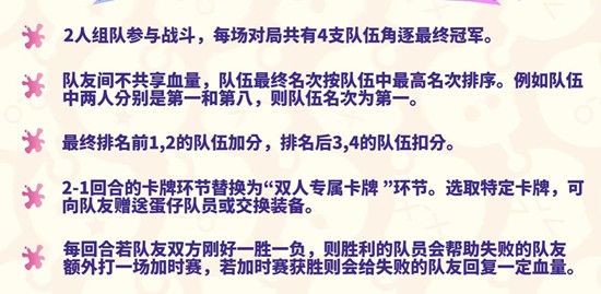 此外,2-1回合将引入“双人专属卡牌”环节,玩家可以向队友赠送蛋仔队员或交换装备,增强团队合作。如果每回合双方一胜一负,胜利的队员还会帮助失败的队友进行加时赛,获胜则可回复血量。
