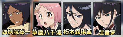 四枫院夜一、草鹿八千流、朽木露琪亚、涅音梦
