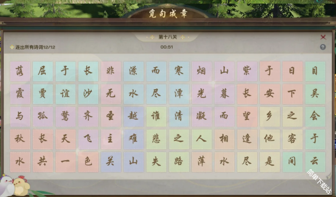 剑网3伊丽川大地图中的探索小游戏觅句成诗,需要将其中的各个诗句连起来组成一句完整的诗句。下方列举介绍详细具体的第十八关觅句成章小游戏答案详情!