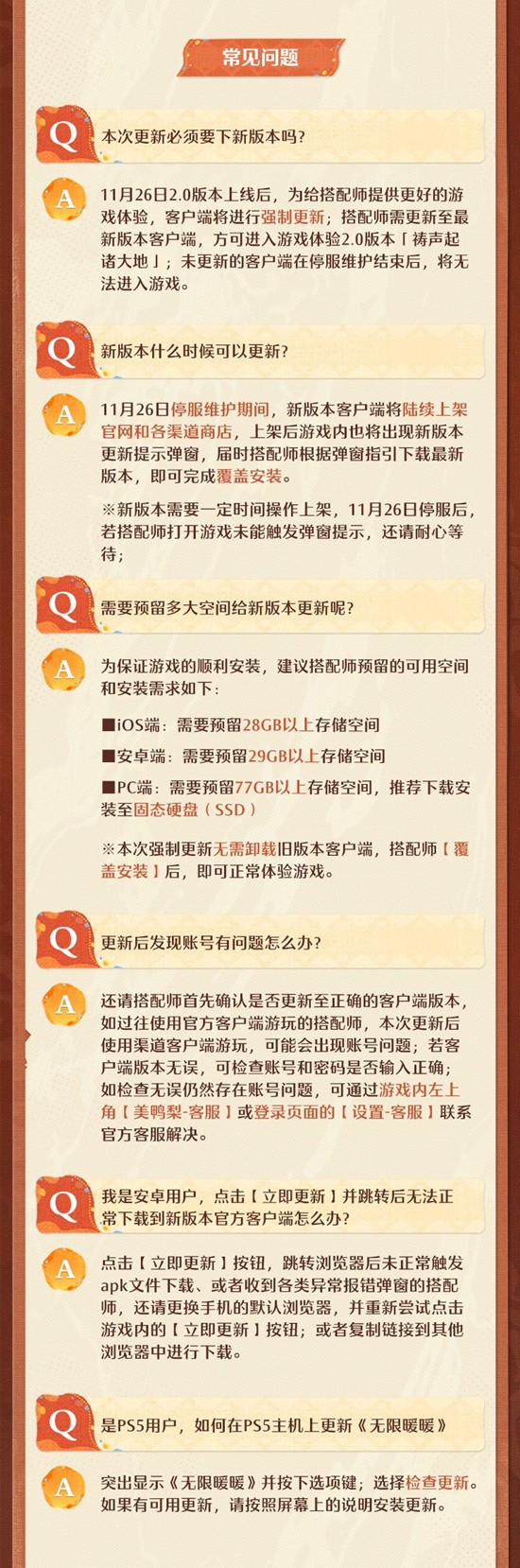 当时间来到11月26日停服维护期间,新版本客户端将陆续在各平台发布。届时,当您打开游戏时,会收到清晰的更新弹窗提示。