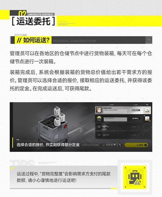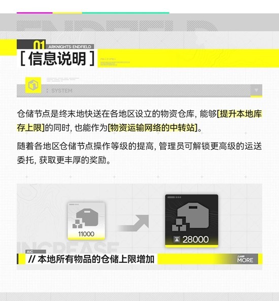 明日方舟:终末地为确保系统高效运行,请通读手册,掌握相关规范准则。随着管理员在塔卫二探索逐渐深入,终末地工业会在各地建立据点,与当地居民建立联系。仓储节点是终末地快送在各地区设立的物资仓库,能够[提升本地库存上限]的同时,也能作为[物资运输网络的中转站]。一起来和小编看看吧~