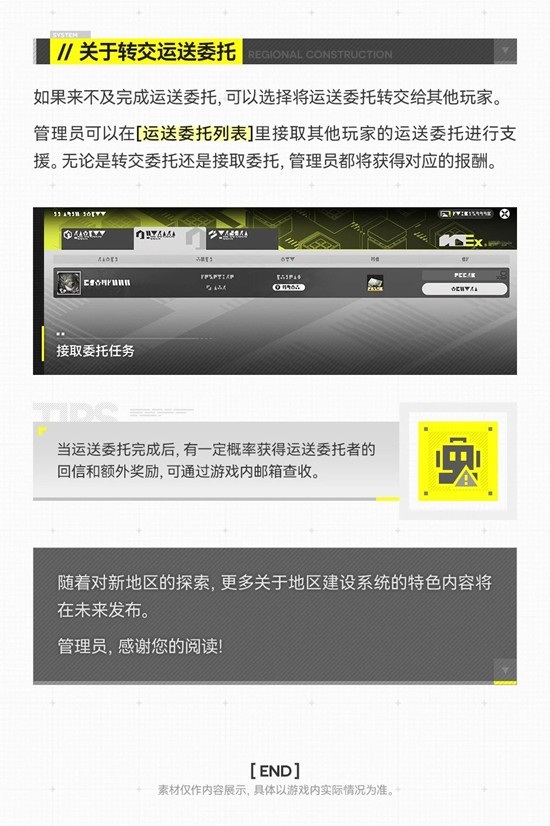 如果来不及完成运送委托,可以选择将运送委托转交给其他玩家,管理员可以在[运送委托列表]里接取其他玩家的运送委托进行支援。无论是转交委托还是接取委托,管理员都将获得对应的报酬。