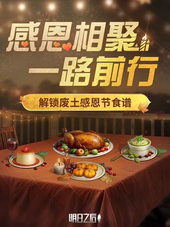 感恩节料理的不仅是美味食物,更是一份珍贵心意。在废土的无数个日夜,因为有好友而更精彩!快向好友赠送美味的感恩节料理,感恩今年一起度过的那些温情时刻!