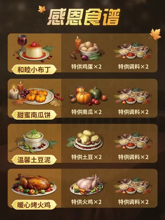 活动期间,玩家们可以通过采集、打怪、钓鱼等玩法获取限定食材,制作四款感恩节限定料理,包括和睦小布丁、甜蜜南瓜饼、温馨土豆泥和暖心烤火鸡。这些料理不仅美味,更是表达心意的绝佳方式。