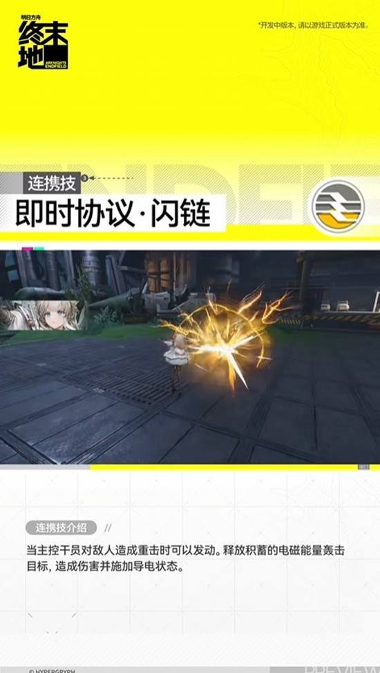 当主控千员对敌人造成重击时可以发动。释放积蓄的电磁能量轰击目标,造成伤害并施加导电状态。
