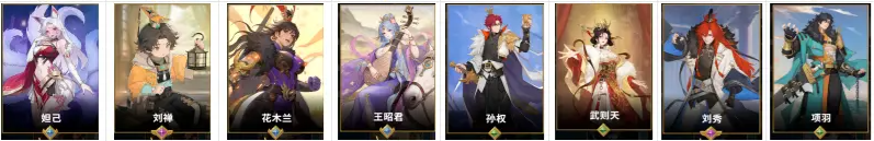 妲己、刘禅、花木兰、王昭君、孙权、武则天、刘秀、项羽