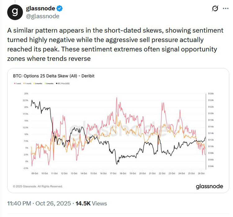 在周日的X帖子中,Glassnode暗示趋势逆转正在酝酿,因为抛售压力和负面情绪似乎已经达到极端峰值。