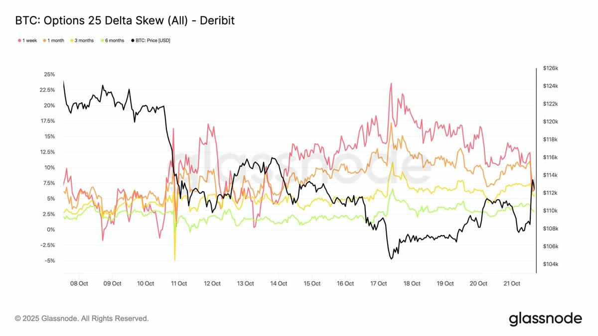 这种结构反映了一个市场愿意为下行保护支付溢价,同时保持有限的上行风险敞口,长期前景中平衡短期恐惧。周二的小幅反弹说明了这种敏感性,看跌期权权利金在几小时内减半,显示了市场情绪仍然多么紧张。