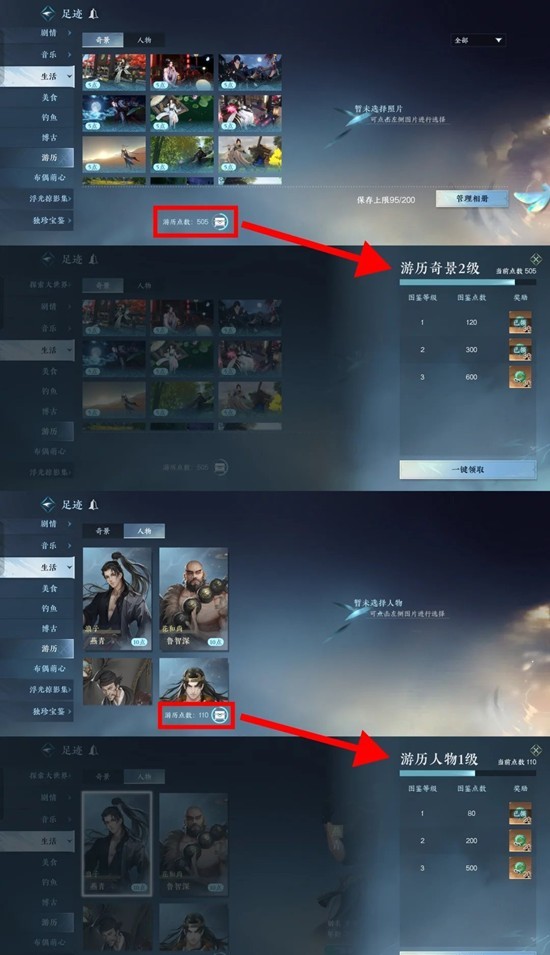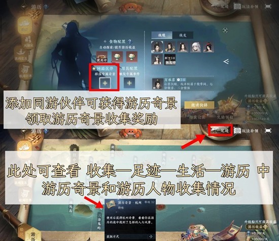 ④与伙伴同游可掉落游历奇景,收集游历奇景、游历人物领取奖励