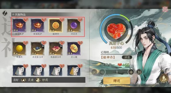 ●礼物品阶定效果:礼物品阶和价值直接决定好感涨幅,通常灵丹、功法、装备等成品灵物>灵植、灵液、妖丹等基础材料,同类别中品质越高效果越好(如金丹级材料>筑基级材料),贵重礼物更易打动NPC。