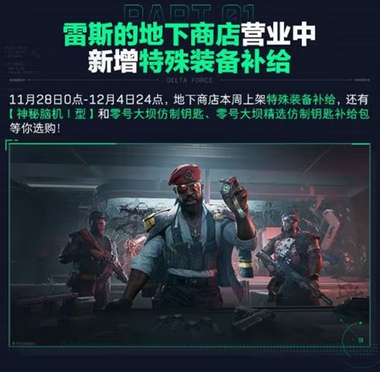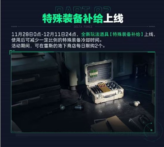11月28日-12月4日,雷斯的地下商店将上架「特殊装备补给」。特种兵们可以前往选购,为战斗增添更多助力!此外,11月28日-12月11日,全新玩法道具「特殊装备补给」正式上线。使用后可缩短特殊装备的冷却时间,让你在战场上更加如鱼得水。