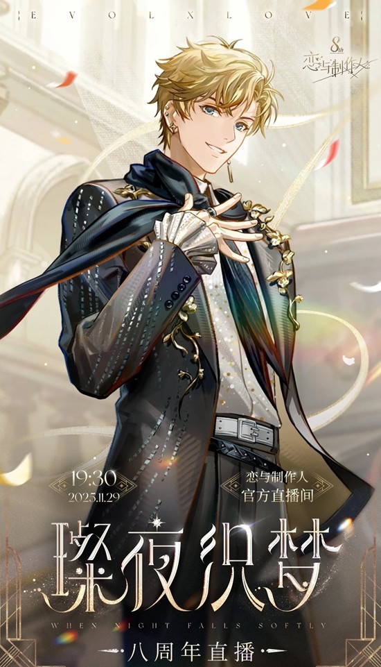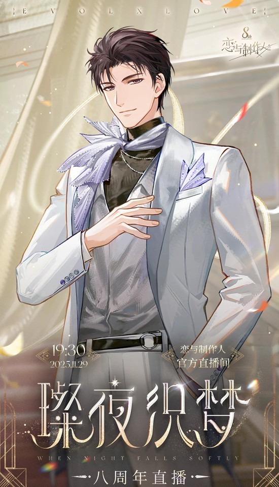 恋与制作人八周年纪念直播11月29日开启!11月29日19:30,与他相约流光盛宴,谱写第八年的华丽序章。恋与制作人八周年邀约序幕「璨夜织梦」——恋与制作人八周年纪念直播即将开启!一起来和小编看看吧~