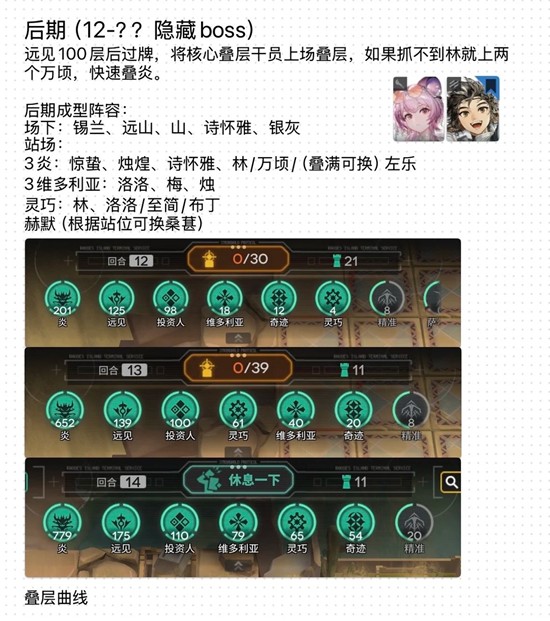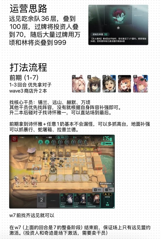 打法流程参考,实际没这么死板,可以根据自己节奏调整。每个阶段旁边也放了核心干员。(不是必须按照这个来抓,只是提供参考)