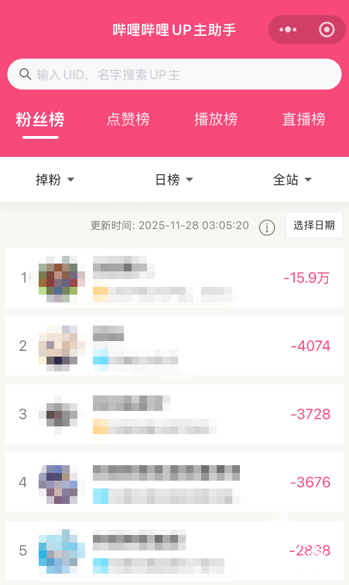 通过在小程序中搜索哔哩哔哩UP主助手,点击进入后就在粉丝榜中查看近期的粉丝增长或减少情况了,还可以点击掉粉选择涨粉或是总榜来查看。
