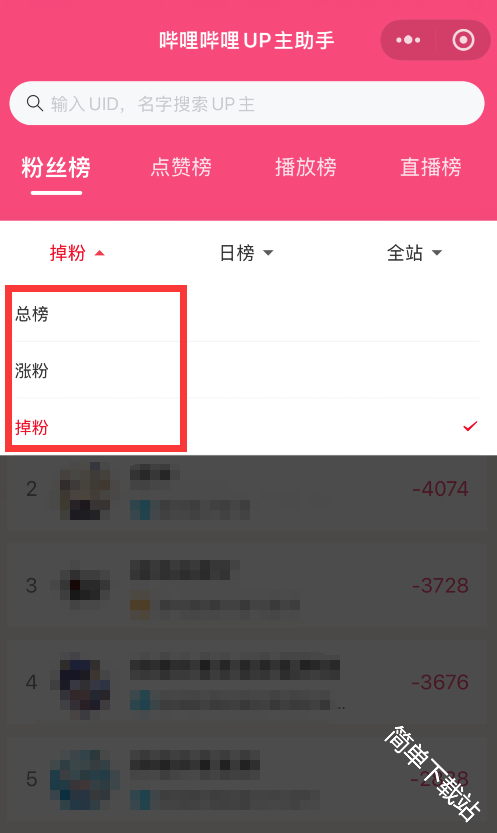 3、还可以点击掉粉来选择涨粉或是总榜来查看