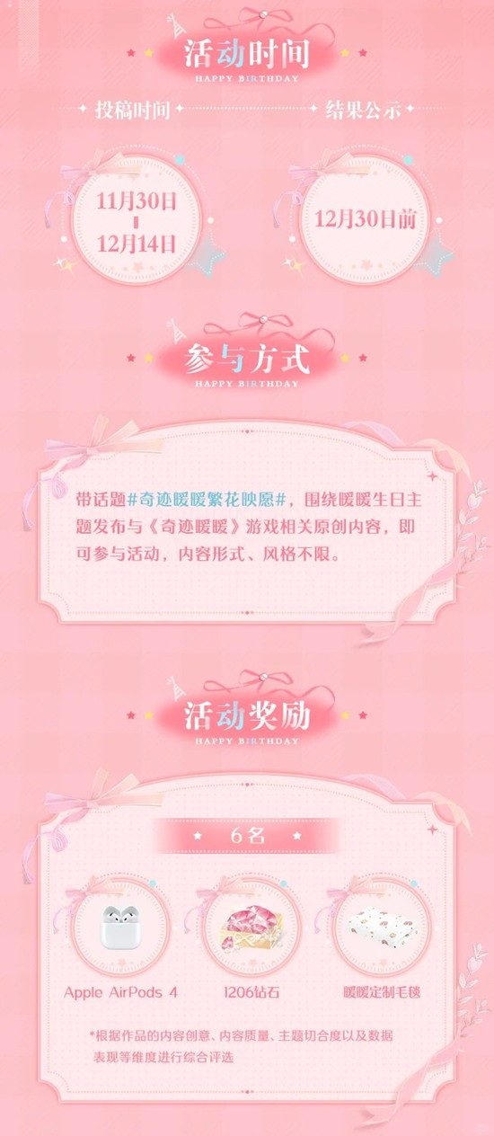 即日起—12月14日,带#奇迹暖暖繁花映愿 话题,围绕“暖暖生日”主题,发布与《奇迹暖暖》游戏相关原创内容,赢【钻石、周边、Airpods】奖励!