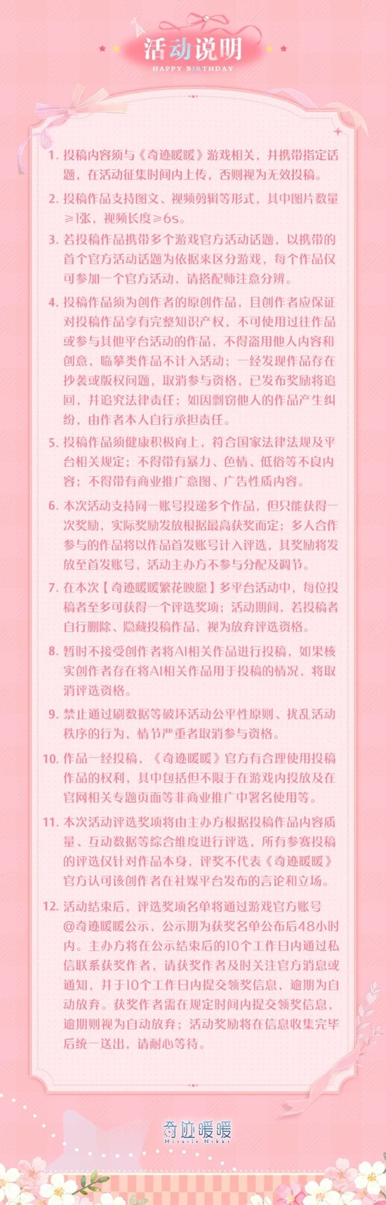 带话题#奇迹暖暖繁花映愿#,围绕暖暖生日主题发布与《奇迹暖暖》游戏相关原创内容,即可参与活动,内容形式、风格不限。
