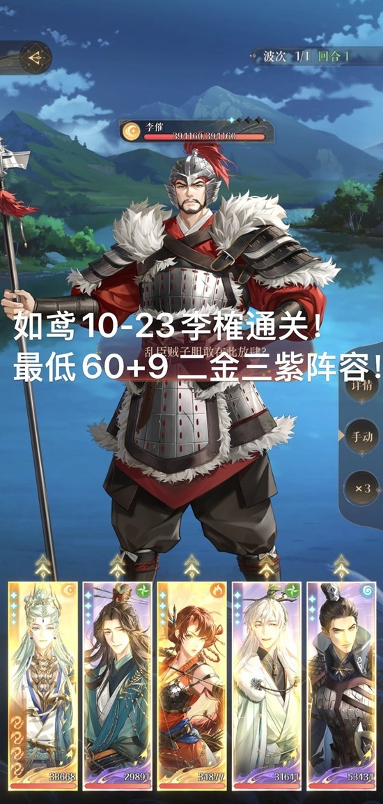 诸葛亮有大就放大,陈登只给诸葛亮拉条即可,这个练度第五六回合就可以把小兵打死,并且再次回溯。第七回合狮子喵大招又好了,从这时候开始就要一直奶血量,适当下拉,保证每个人都在场,不给李傕减能量上限的机会。