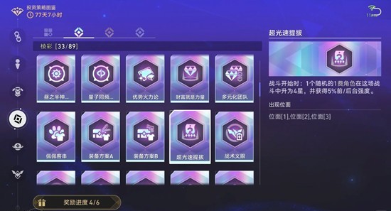 ①阿格莱雅:唯一输出位。尽量要3星阿格莱雅,不然伤害不够。有一个「投资策略」可以把一个一费角色直升四星,叫做「超光速提拔」,看到的话就选它。装备的话我选择两个「反重力皮靴」以及一个「光速螺旋桨」,两个「反重力皮靴」为阿格莱雅叠速度,然后「光速螺旋桨」把速度转化为前台强度,实战中阿格莱雅动15次(对阿格莱雅不难达到),两个「反重力皮靴」就能给阿格莱雅叠到2000多速度,同时「光速螺旋桨」能给阿格莱雅叠到四五百前台强度。装备成型对阿格莱雅很重要,「光速螺旋桨」只要刷到一费阿格莱雅、二费缇宝以及二费风堇,系统就会附赠这个装备,重点在于合成两个「反重力皮靴」所需要的四个「轮滑鞋」上,这个不一定局局能拿到,但是可以通过一些选择来提升拿到的概率,有一个投资环境叫做「过剩经费」,补给阶段角色会带两件「简易装备」,这样就很容易就可以选到轮滑鞋。