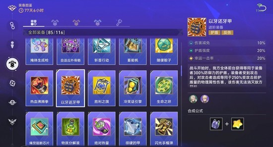 ④盾丹:生存位。进一步提升生存能力,毕竟死一次会掉很多行动值,实在是死不起,因此生存也很重要。推荐装备「以牙还牙甲」,可以开局就给全队套一个盾,避免还没有轮到盾丹出手,队友就先被怪物打死了。