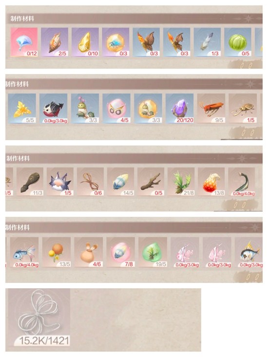 9.草棘果×5(靠这个果子太近会被刺伤的,巨兽身上也有这个果子,可以用变大套在前面吼巨兽震住对面一会,然后跑到后面把它吼晕,再清洁一下,获得巨兽材料)