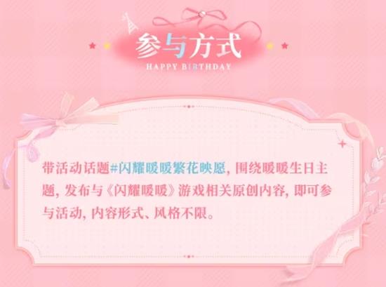 在B站发布与《闪耀暖暖》相关的原创图文或视频(图片≥1张/视频≥6秒),带话题#闪耀暖暖繁花映愿#即可参赛。