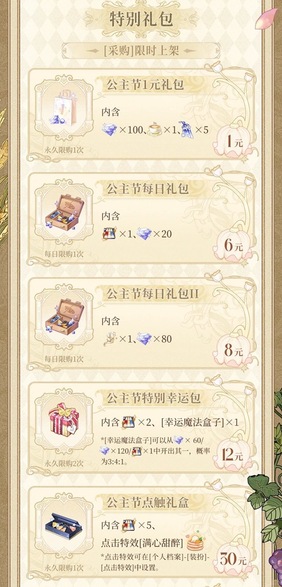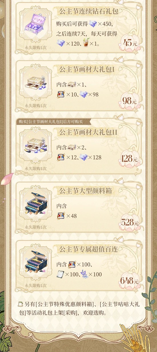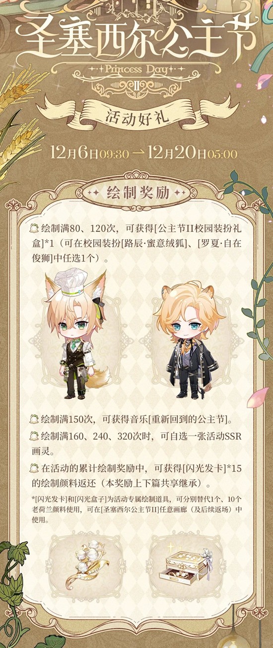 *[闪光发卡]和[闪光盒子]为活动专属绘制道具,可分别替代1个、10个老荷兰颜料使用,可在[圣塞西尔公主节II]任意画廊(及后续返场)中使用。
