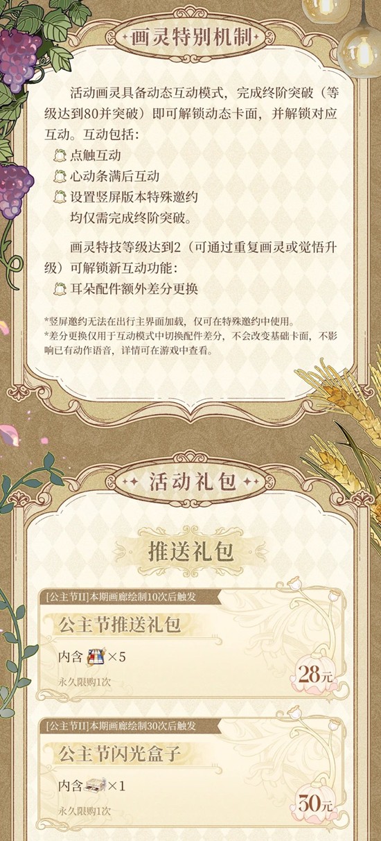 ► 在[圣塞西尔公主节·绮愿]中,路辰SSR[目之彼端]获取概率提升至70%,其他常驻画灵不变,无法获取罗夏SSR[心城漫溯]。