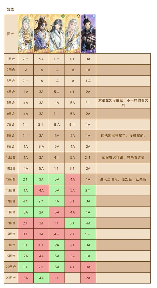 第一阶段五回合一循环,回合一张邈先手,回合二三颜良先手,回合四诸葛亮先手,第五回合看机制
