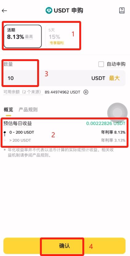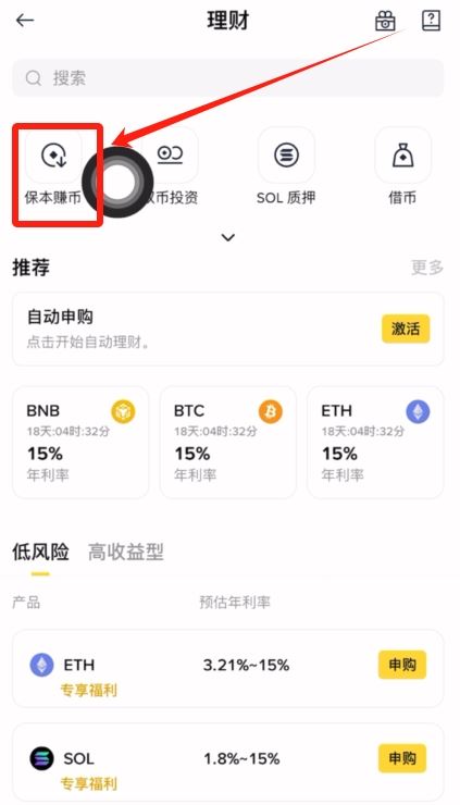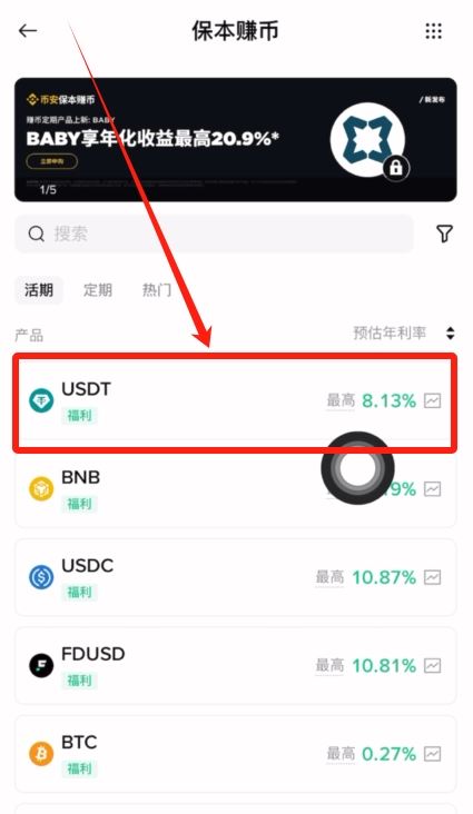 完成注册认证后,打开APP点击顶部【理财】入口,选择【保本赚币】板块。USDT活期产品显示最高收益可达8.13%年化率,输入申购金额并确认即可完成投资。