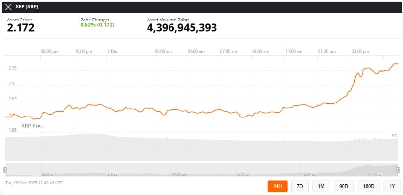 根据Brave New Coin的最新数据,XRP的交易价格接近2.17美元,过去24小时内上涨了8.62%,日交易量为43.9亿美元。