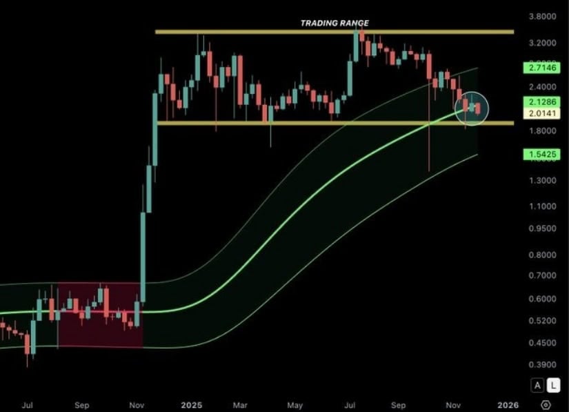 XRP在高斯通道中带附近维持了数月的交易区间,2.12美元的周线收盘价对维持支撑至关重要。来源:X平台上的@ChartNerdTA