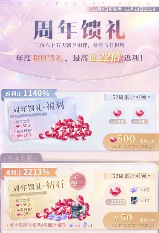 恋与制作人周年馈礼新品上架,超值返利明日开启~活动期间,四款周年馈礼商品限时发售,最高可获得超22倍返利!花费【钻石*500】,在活动界面购买周年馈礼·福利,将立即获得【钻石*500】。购买后每周参与领取,52周累计可以获得【钻石*5700】的最终奖励!一起来和小编看看吧~