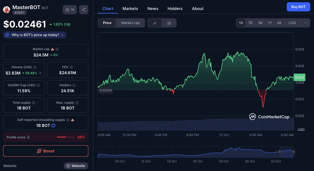 $BOT现报价$0.025 USDT,24小时涨幅达30%,交易量突破$300万。市值约$2500万,在CoinMarketCap排名#3693。10亿代币总量已全部释放,主要交易在Orca等去中心化交易所。