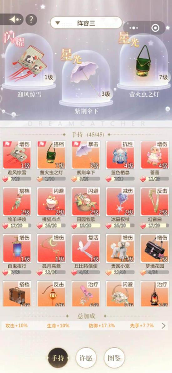 手持推荐选择那些附带高闪避率的,例如田园牧歌、橘猫点点和花园时光。至于学院搭档的选择,玩家需要根据整体阵容的入梦能量和实战需求来调整,如果生存压力不大,可以携带增伤型搭档;若需要续航,则选择治疗属性的队员。通常,入梦能力达到3200万左右,这套阵容能实现约3739万的伤害,整体对抗无限梦境世界威武的效果非常理想。