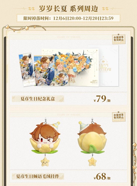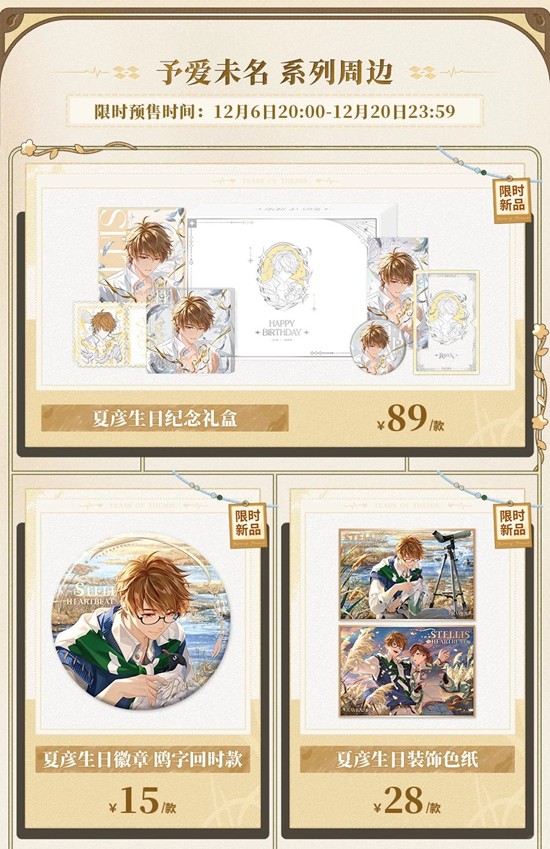 《未定事件簿》「予爱未名·夏彦篇」系列周边明日开启限时预售~2025年12月6日-12月20日「予爱未名」系列周边开启限时预售,「岁岁长夏」系列周边限时余量掉落,一起来和小编看看吧~