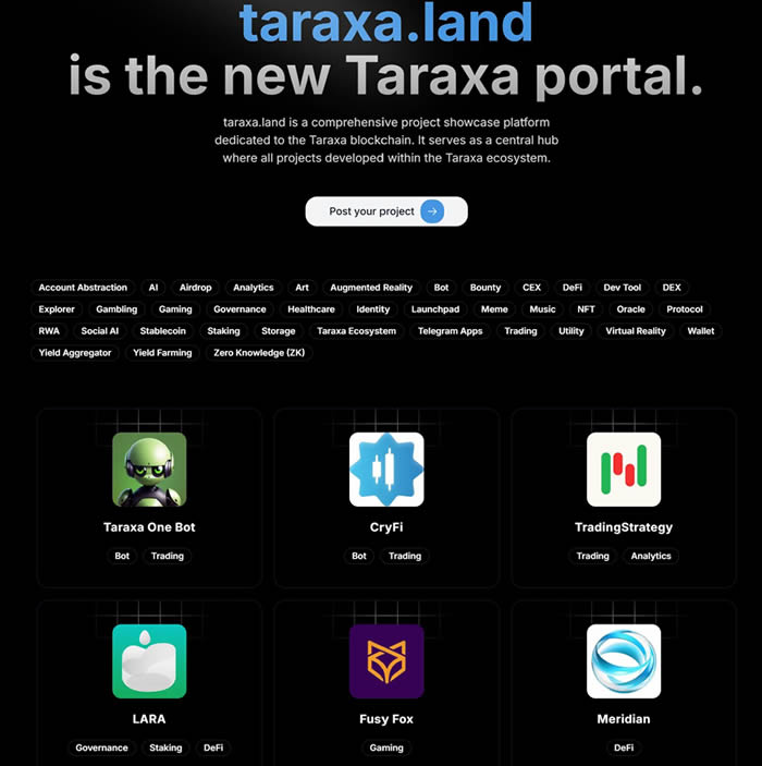 Taraxa生态涵盖taraSwap、Trend Moon等多个项目,通过1000万美元资助计划持续扩展。taraxa.land门户集中展示生态项目进展。