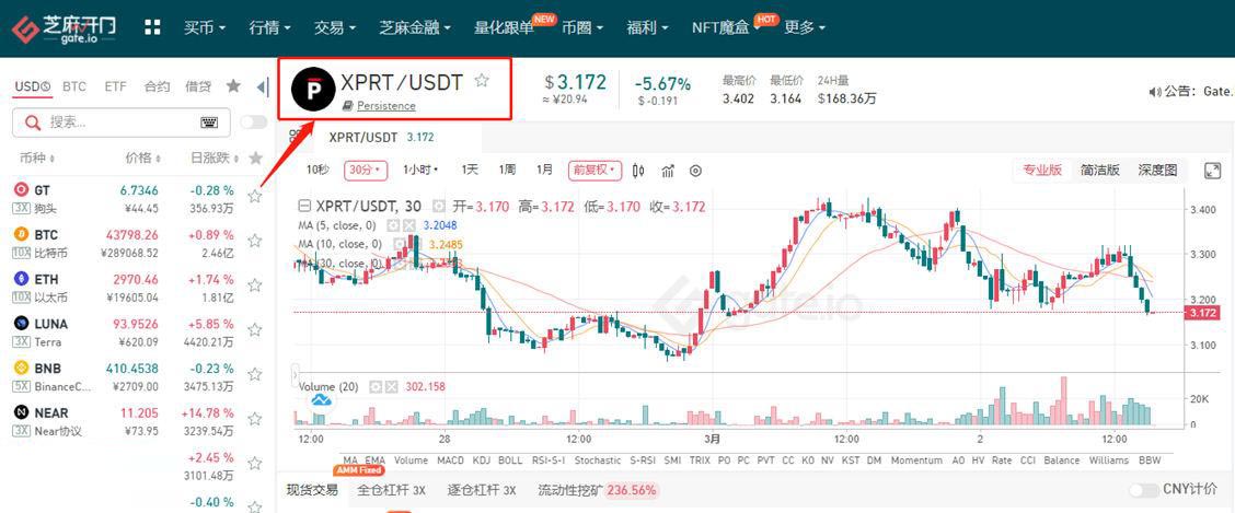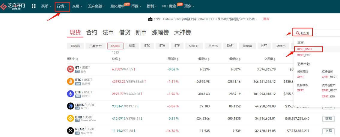 2.在行情页面搜索XPRT交易对,选择XPRT/USDT交易对进入操作界面