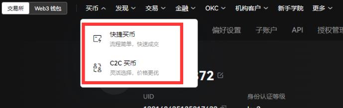 2.导航至【买币】功能区,根据需求选择"快捷买币"或"C2C买币"模式,本教程以快捷买币为例;