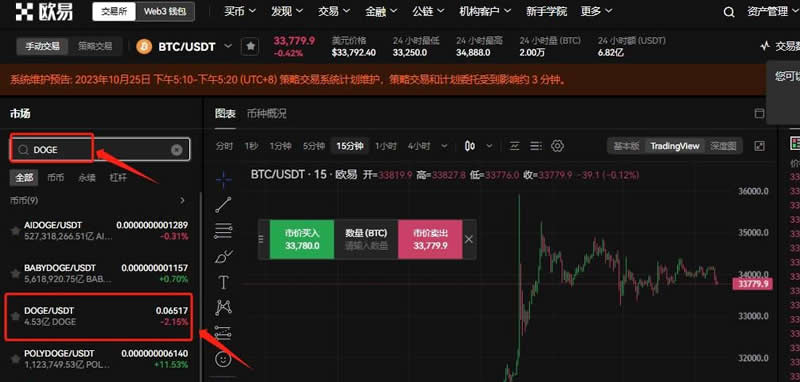 4.进入"交易-基础交易"页面,搜索DOGE/USDT交易对